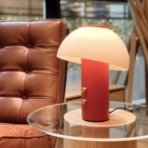 Le luminaire porte une tige et deux cylindres massifs brossés qui épousent sa base. Une touche de brillance lorsqu’illuminée, légèrement voilée par son chapeau haut perché.