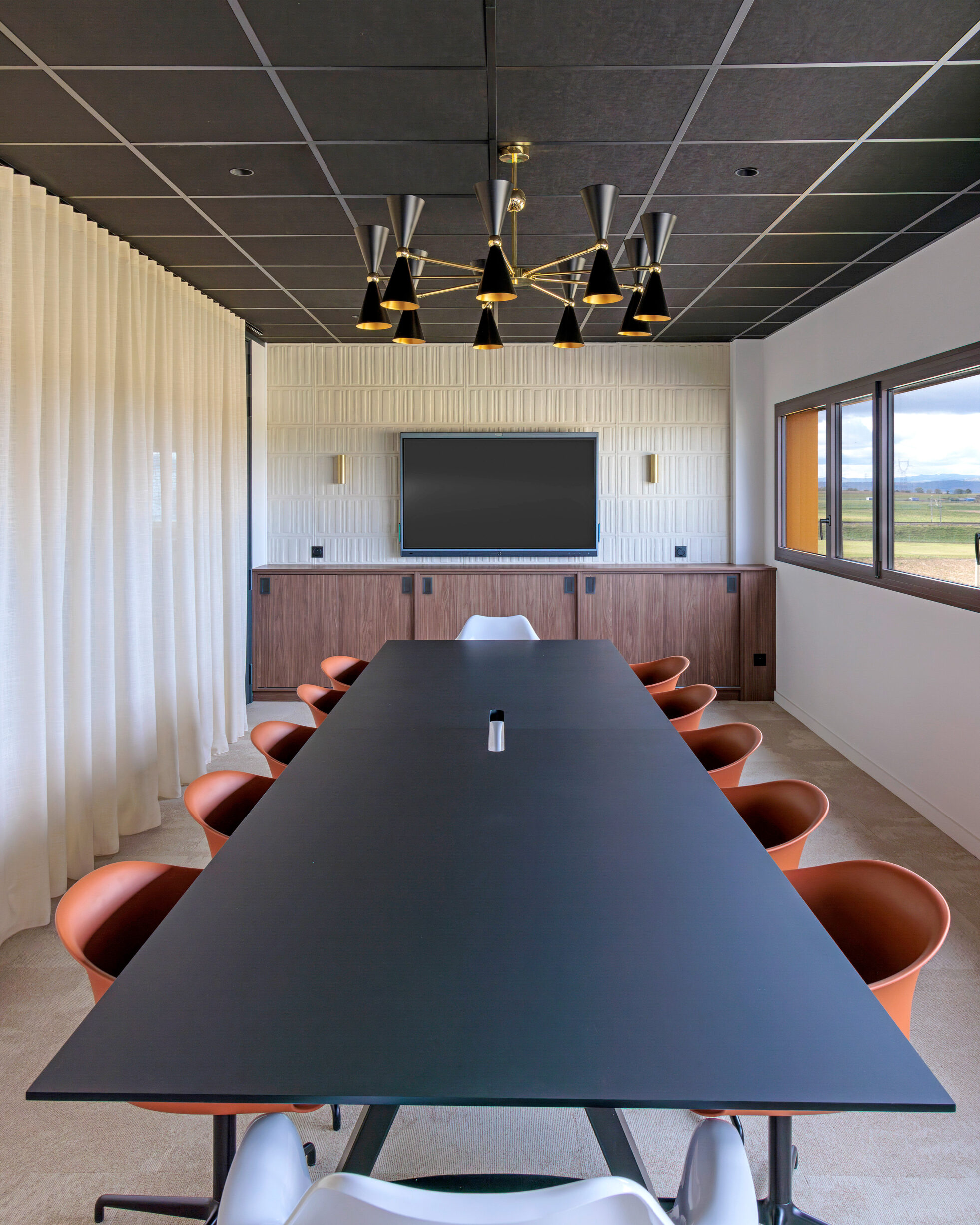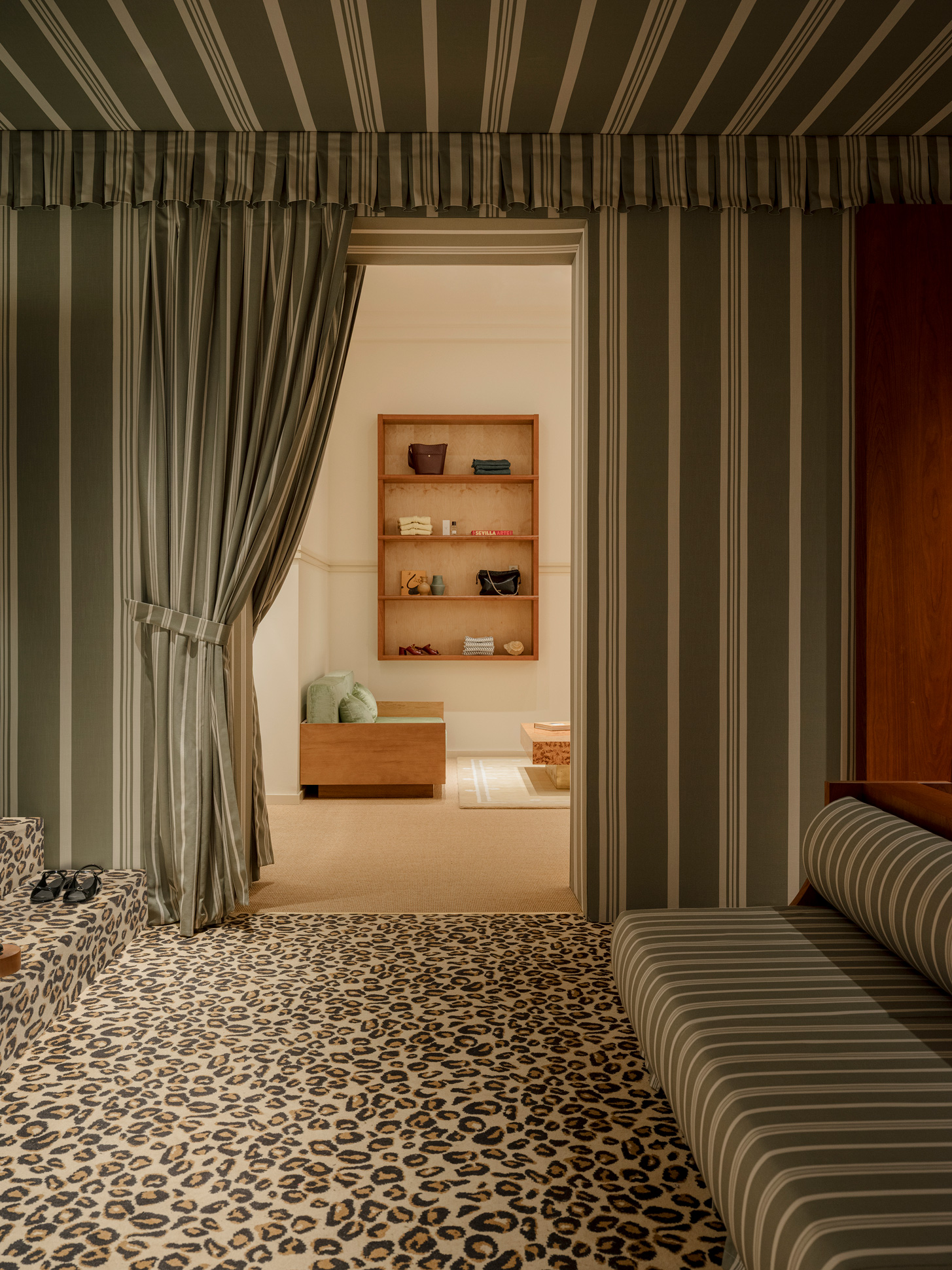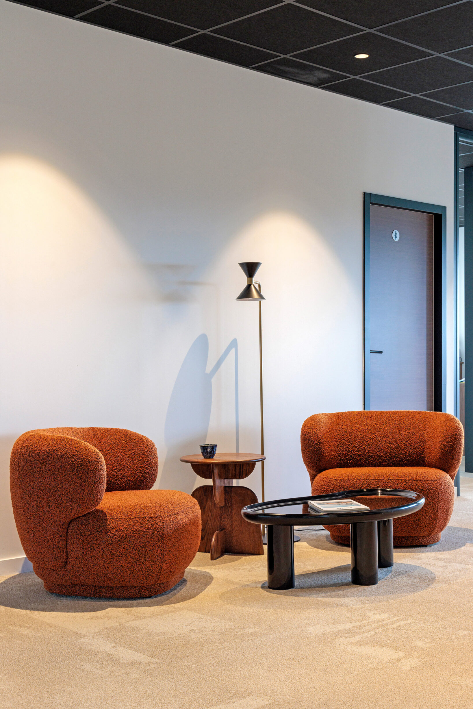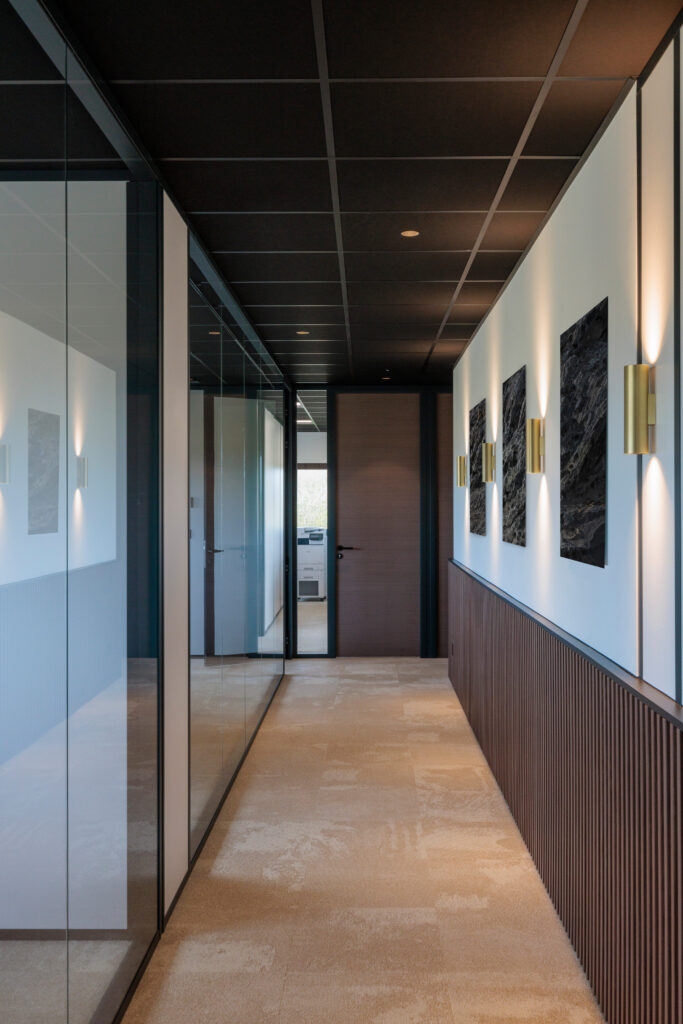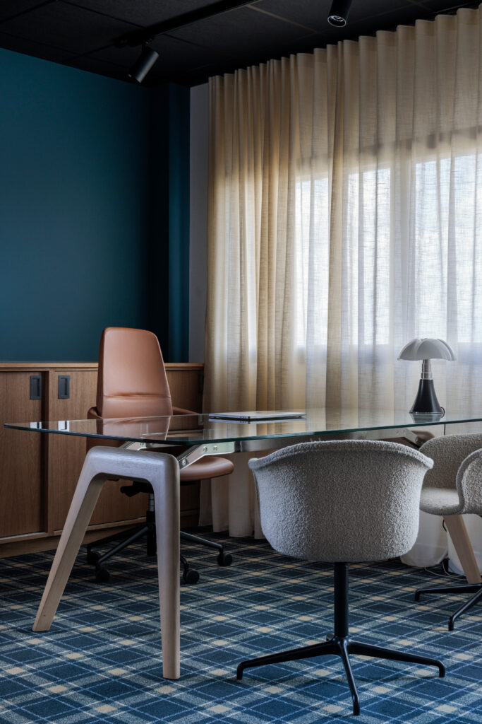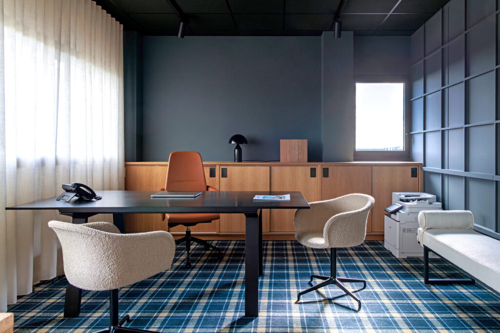 Inspiré de l’élégance des années 60, le projet joue sur des contrastes subtils entre moquettes sable ou tartan sur mesure, plafonds sombres, boiseries en noyer, textiles plissés et cloisons vitrées laissant circuler la lumière. Mobilier sélectionné chez L’Ensemblier.