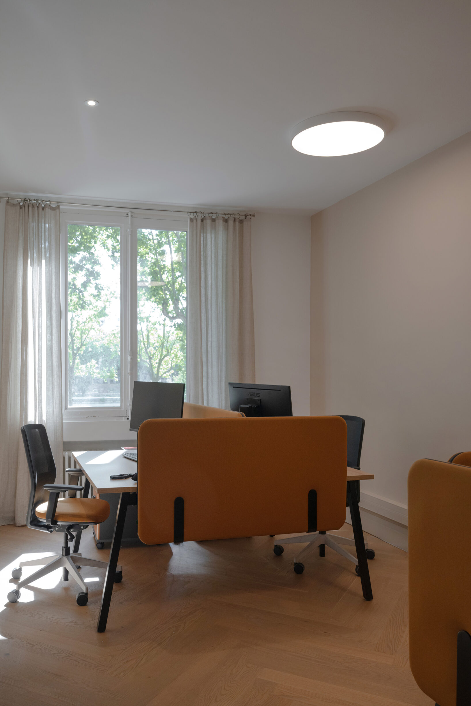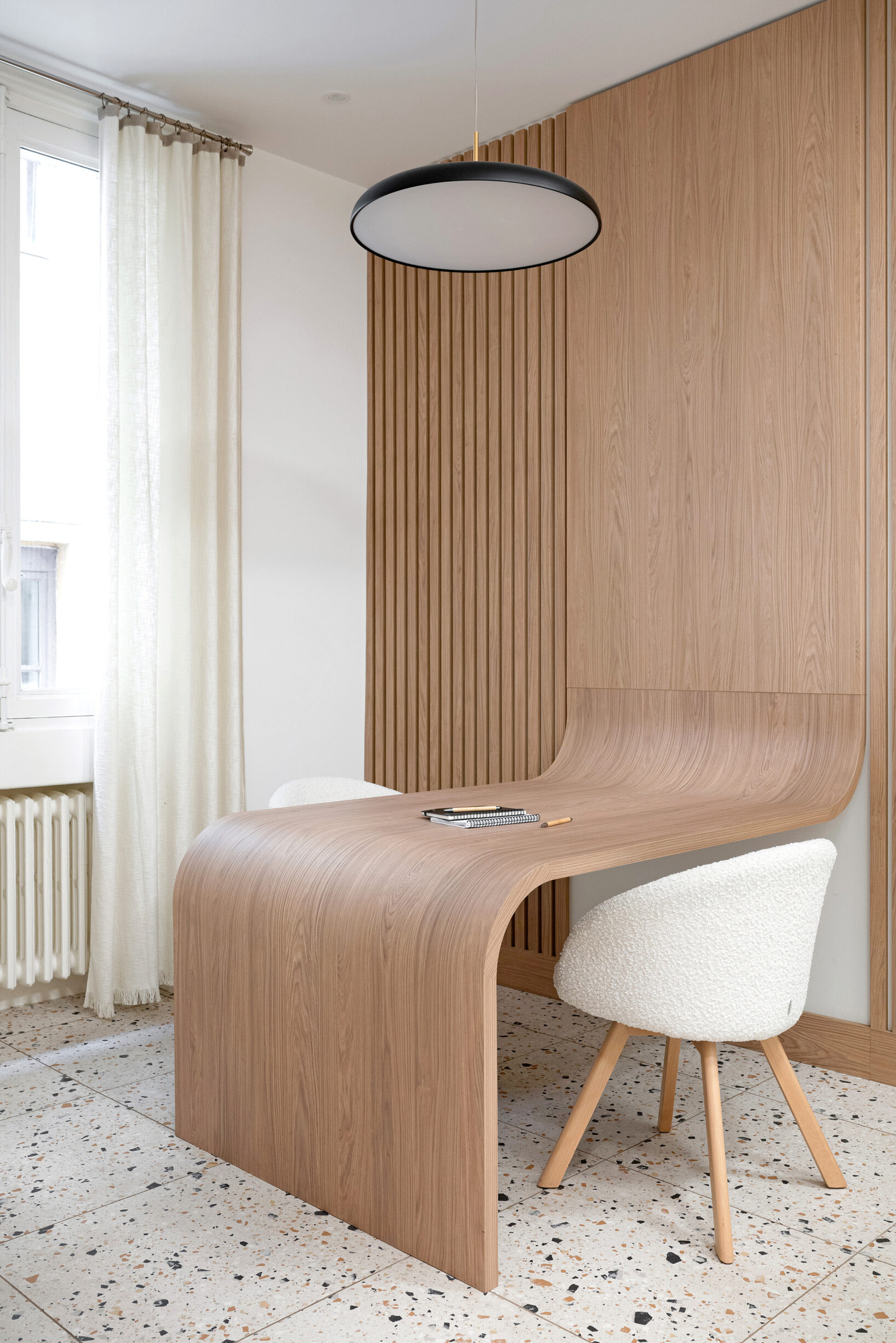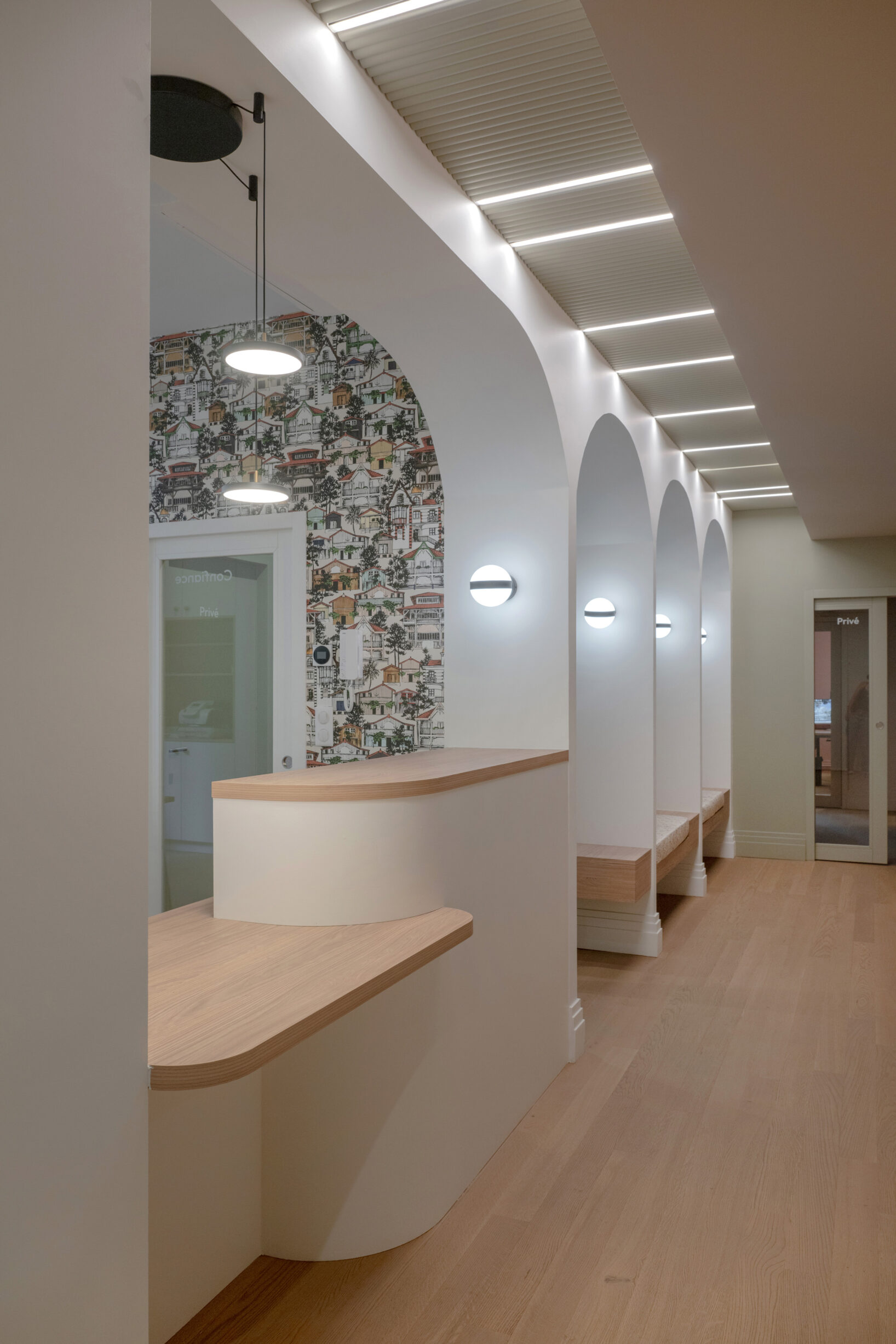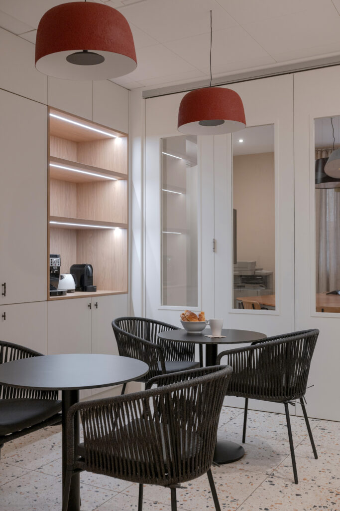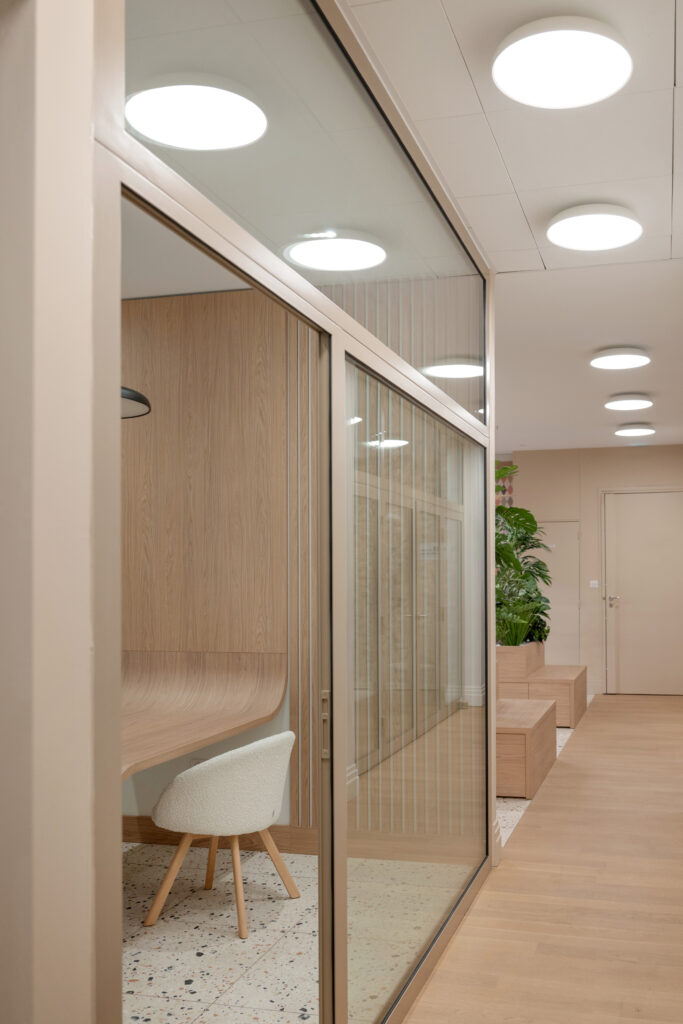 Cette rénovation a créé une atmosphère douce et accueillante, tout en optimisant les volumes pour offrir un environnement de travail confortable, apaisant et propice au bien-être quotidien.