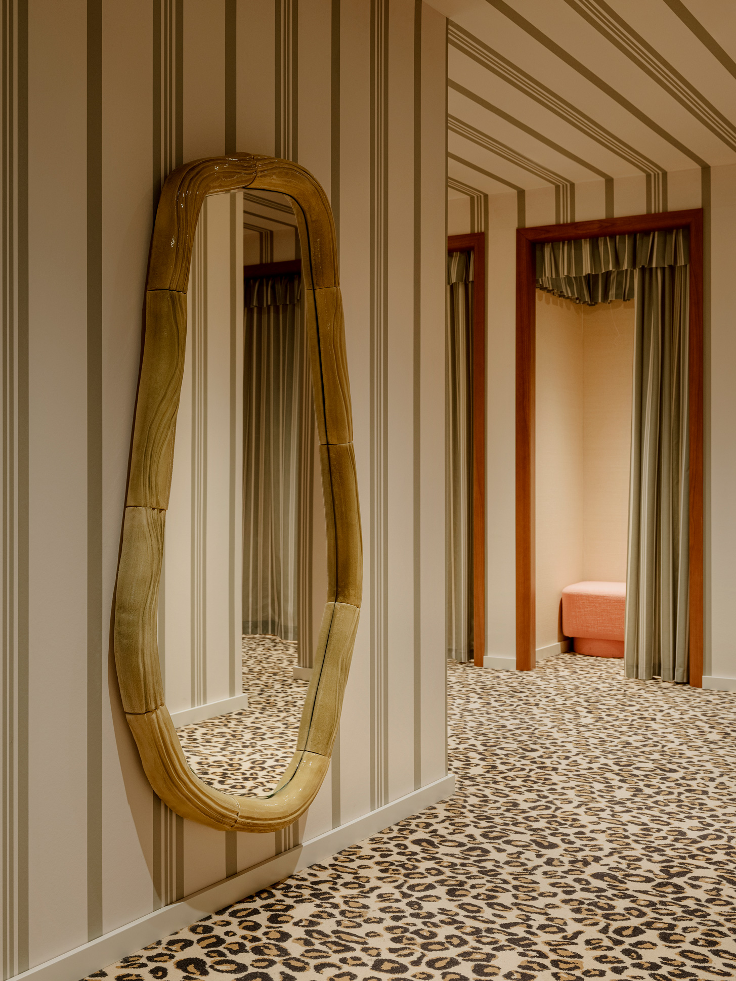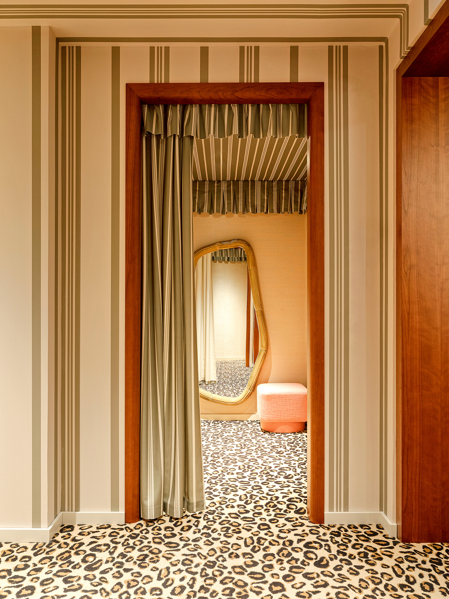 • Atelier Bruneel : réalisation des tentures murales et cantonnière plissée en partie haute. L’ensemble des rideaux (séparation, voilage, rideaux cabine). Retapissage des poufs et fauteuils en rose (tissu de chez Dedar)